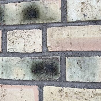 Detta hus från 55 har mörka fläckar i det gula teglet, utspritt över fasaden. Sprickbildning i fläckarna.