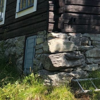 Vi har en 1800-tals timmerstuga som har en grund murad med natursten. Huset har stått i fjällmiljö i Härjedalen på samma plats sedan 60-talet och vilar på större stenar i hörnen. På ett par ställen runt om huset har nu murbruket börjat släppa och på gavlarna skjuter hela muren ut från väggen.