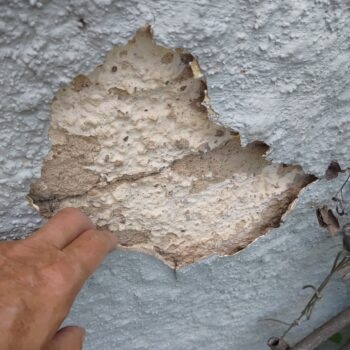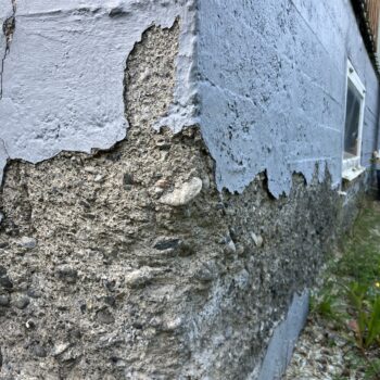 Vi har en spritputsvägg som är målad först med en cementbaserad färg och därefter med en plastfärg. Vad göra?