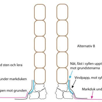 Vi ska renovera mullbänken i vårt torp från 1820-talet med perlite, i vilken ordning ska vindpapp och markduk läggas? Samt bör man behandla invändig syll och stockar med Protox Svamp för att förebygga svampangrepp?