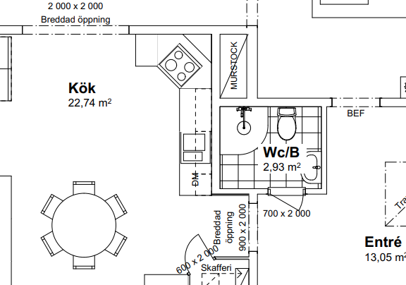 De tänkte även sätta in en dusch där badkaret är idag. Problemet är att i hörnet finns ventilen till kanalen. Fungerar det att ha en dusch precis där i hörnet? Och vad händer med ventilationen?