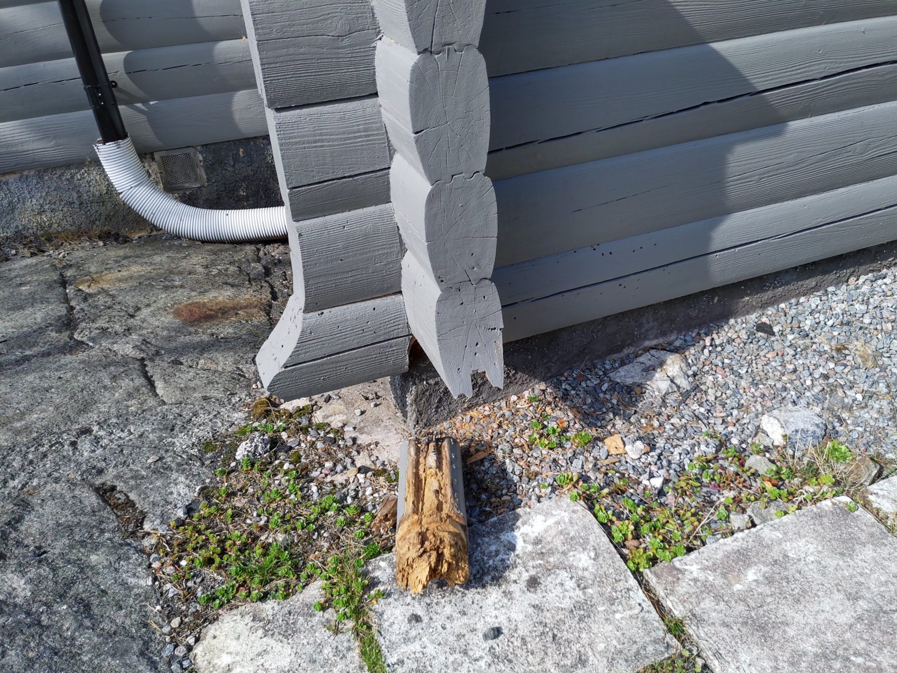 Vi har fått rötskada och myrangrepp på vårt timmerhus i Stockholms södra skärgård. Understa stocken har i änden gått av helt och vi vet inte hur mycket andra stockar är skadade.