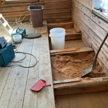 Vårt hus från 1945 med en utbyggnad från 1960. Vinden är inredd och kall, och golvet i nya delen är ca 15 cm högre än resterande golv. I våningen under den nya delen ”låter” /klickar innertaket lite när det blåser. Isolationen nu är kutterspån.
