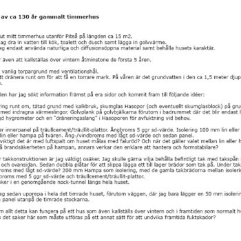 Jag vill vinterbona mitt timmerhus så att det går att bo där även på vintern. Det ska även kunna kallställas och därför vill jag ha genomgående diffusionsöppna lösningar för grund, vägg och tak. Håller mina idéer?