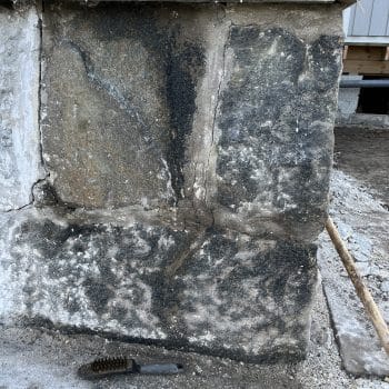 Vi återställer en granitgrund från att den varit målad och sedan även kalkputsad. Det är ca 80-100 cm synligt över mark.