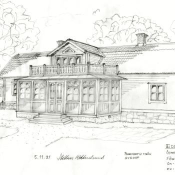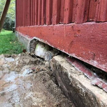 Vi har tagit över ett timmerhus med mullbänk från troligt 1850 tal. Tyvärr är hela muren cementputputsad, den har spruckit och fallit bort i större sjok på vissa ställen, större långa springor har även bildats mellan träsyllen och stengrunden där vatten har tagit sig in.